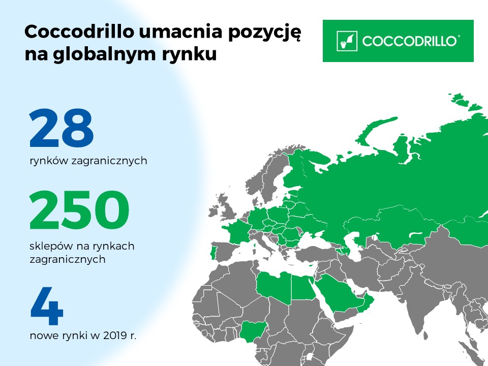Wzrasta dostępność i rozpoznawalność produktów Coccodrillo na świecie. Marka dostępna jest już na 28 rynkach zagranicznych. Tylko w tym roku firma pojawiła się w czterech nowych krajach i otworzyła kolejne punkty sprzedaży w Czechach, Czarnogórze, Rosji i na Łotwie.
